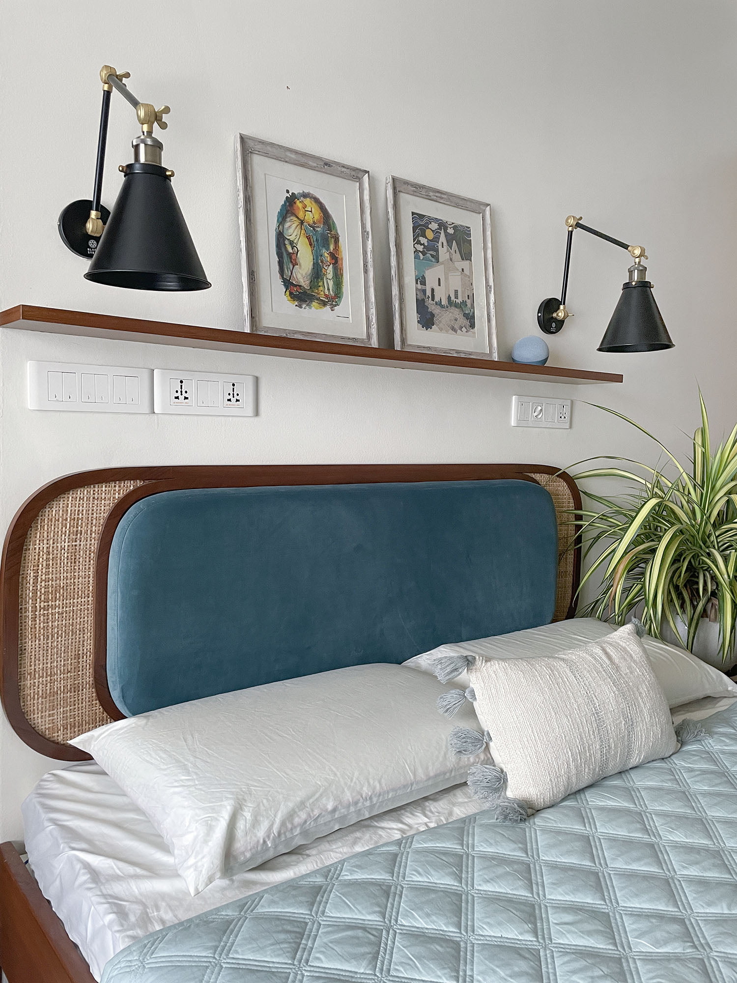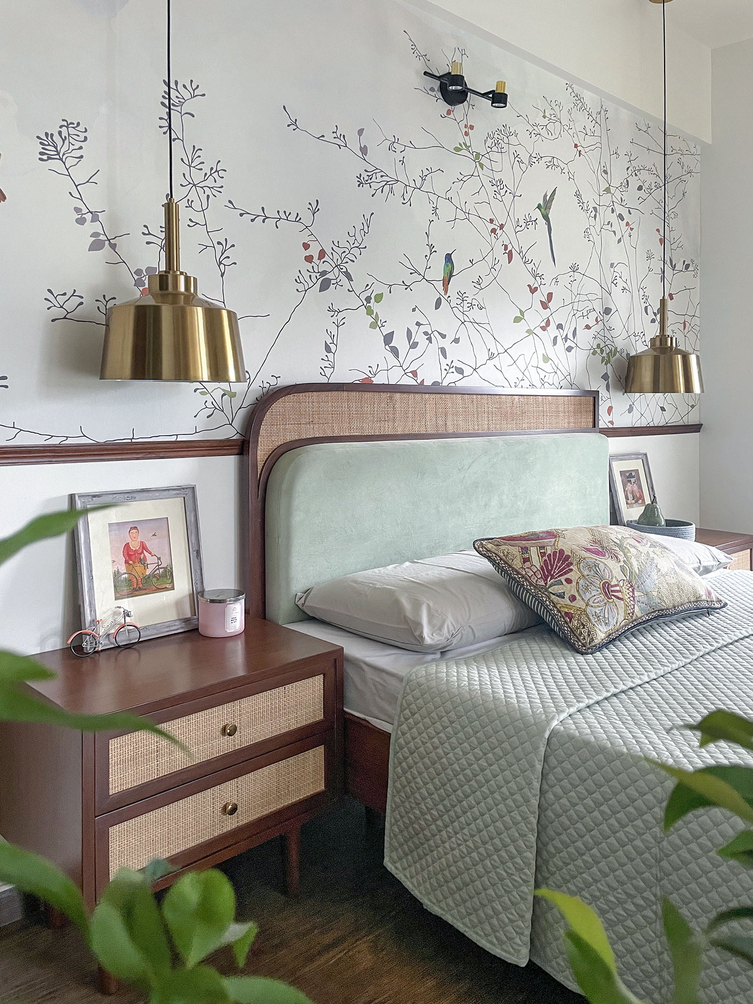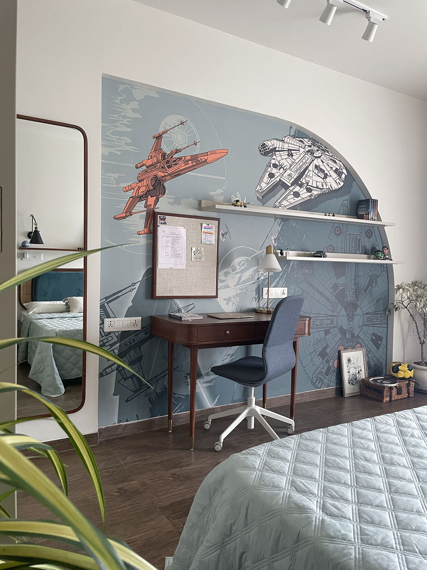 In the girl’s room, we decided to give a resort-like feel using key elements such as customized wallpapers with natural motifs, use of the natural cane and sticking to an overall pastel green colour palette. For the boy’s room, the wallpaper was the focus having iconic Star Wars scenes and characters. For the colour palette we used cosmic colours with deep blue hues, blacks, and accents.